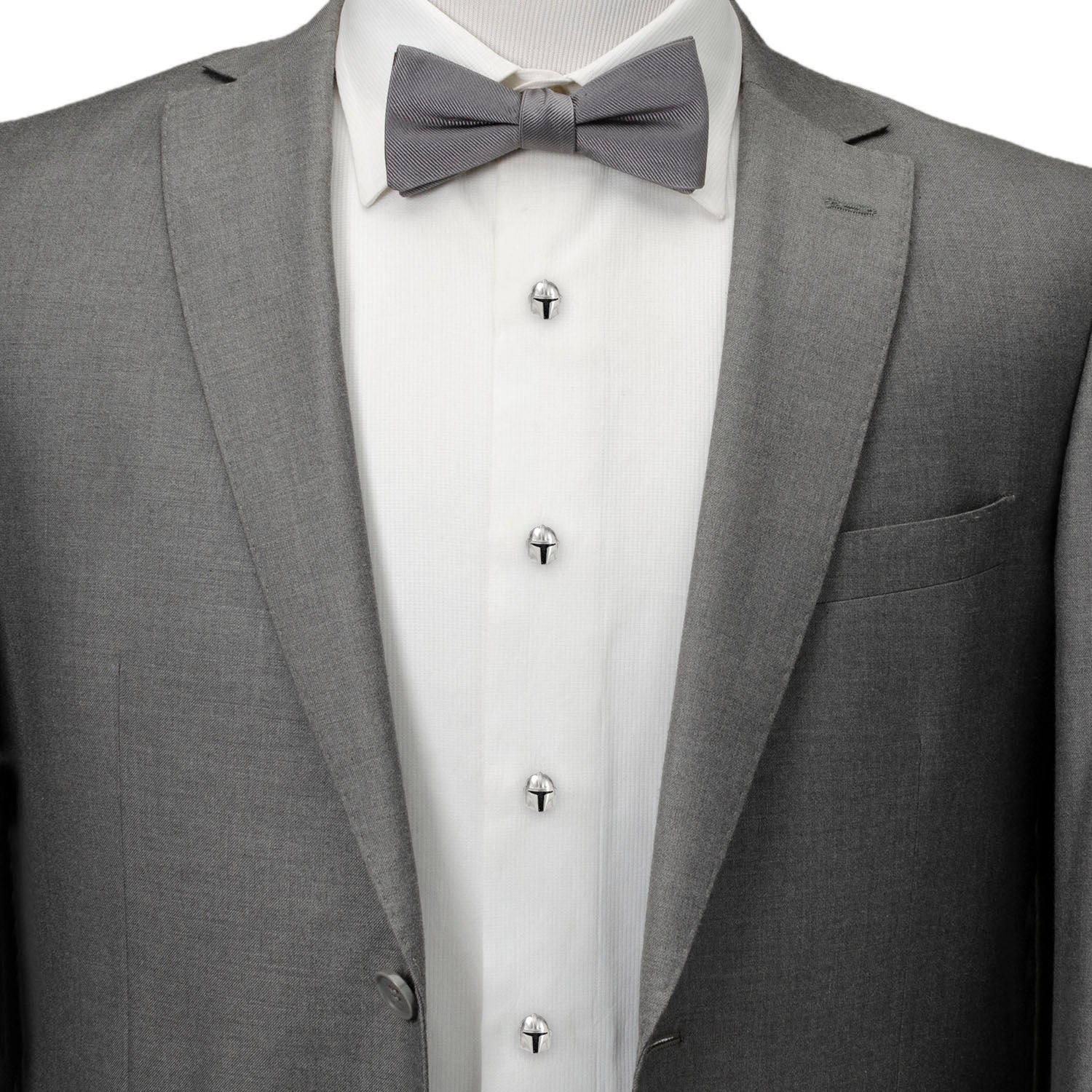 Since members of the Mandalorian guild never take off their helmets, we figured they deserved a tribute. This set of 3D studs feature Mando's helmet set in shiny silver. Black detailing adds dimension to the aesthetic of the cufflink. The fixed backing features a debossed mythosaur skull on the reverse side. Experience the Way of the Mandalore with our expertly crafted Stainless Steel studs. They are built to withstand the challenges of bounty hunting across the galaxy, infused with the honor of Mandalorian creed, and ready to accompany you on interstellar hunts. Pairs perfectly with our 3D Mandalorian Cufflinks. Officially licensed by LucasFilm LTD.