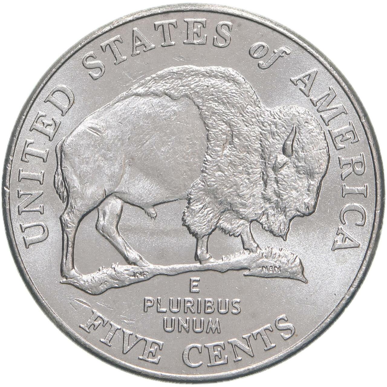 In 2004 and 2005, the U.S. Mint commemorated the bicentennials of the Louisiana Purchase and the Lewis and Clark expedition with the Westward Journey Nickel Series. The American Bison Nickel is the third of four coins in the series. The obverse design, for the first time in 67 years, shows a new likeness of America’s third president, Thomas Jefferson. The image appears only on the 2005 nickels in recognition of Jefferson’s role in the Louisiana Purchase and in commissioning the Lewis and Clark expedition. The design is based on the marble bust by the French sculptor Jean-Antoine Houdon, completed in 1789. The portrait was made age-appropriate to his presidency by utilizing later paintings by Gilbert Stuart and Rembrandt Peale. The new obverse image of Jefferson replaces the image that had been on the nickel since 1938. The reverse features an American bison, referred to as a buffalo. Lewis and Clark expedition journals described the buffalo, and it was an animal of great significance to many Native American cultures. The image of a buffalo adorned the reverse of the nickel from 1913-1938.