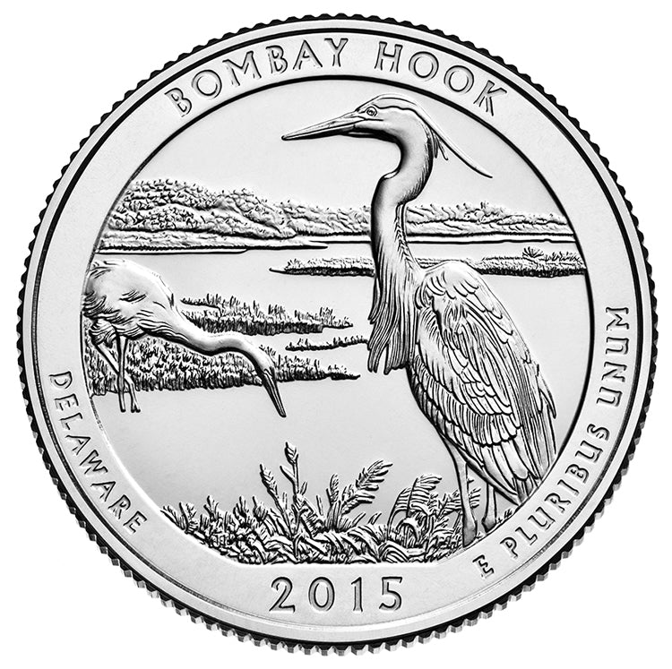 The Bombay Hook National Wildlife Refuge is a 15,978 acres National Wildlife Refuge located along the eastern coast of Kent County, Delaware, United States, on Delaware Bay. It was established on March 16, 1937 as a refuge and breeding ground for migratory and wintering waterfowl along the Atlantic Flyway. In 2010, the United States Mint began issuing 56 quarter-dollar coins featuring designs depicting national parks and other national sites as part of the United States Mint America the Beautiful Quarters Program.