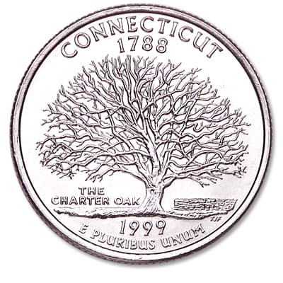 Released on October 12, 1999, this is the fifth coin released in the 50 State Quarters Program and the fifth released in 1999. Connecticut, admitted into the Union on January 9, 1788, highlighted the The Charter Oak tree which proved to be a good hiding place for the state's original Constitution. Connecticut is a U.S. state in southern New England that has a mix of coastal cities and rural areas dotted with small towns. Mystic is famed for its Seaport museum filled with centuries-old ships, and the beluga whale exhibits at Mystic Aquarium. On Long Island Sound, the city of New Haven is known as the home of Yale University and its acclaimed Peabody Museum of Natural History. Launched in 1999, the United States Mint’s 50 State Quarters Program was a 10-year initiative that honored each of the nation’s states in the order that they ratified the Constitution or were admitted into the Union. Each quarter was produced for about 10 weeks and will never be produced again. State designs are displayed on the reverse (tails) of the quarters, while the obverse design displays the familiar image of George Washington. But, to accommodate state designs on the reverse, the words “United States of America,” “Quarter Dollar,” “Liberty,” and “In God We Trust” all appear on the obverse.