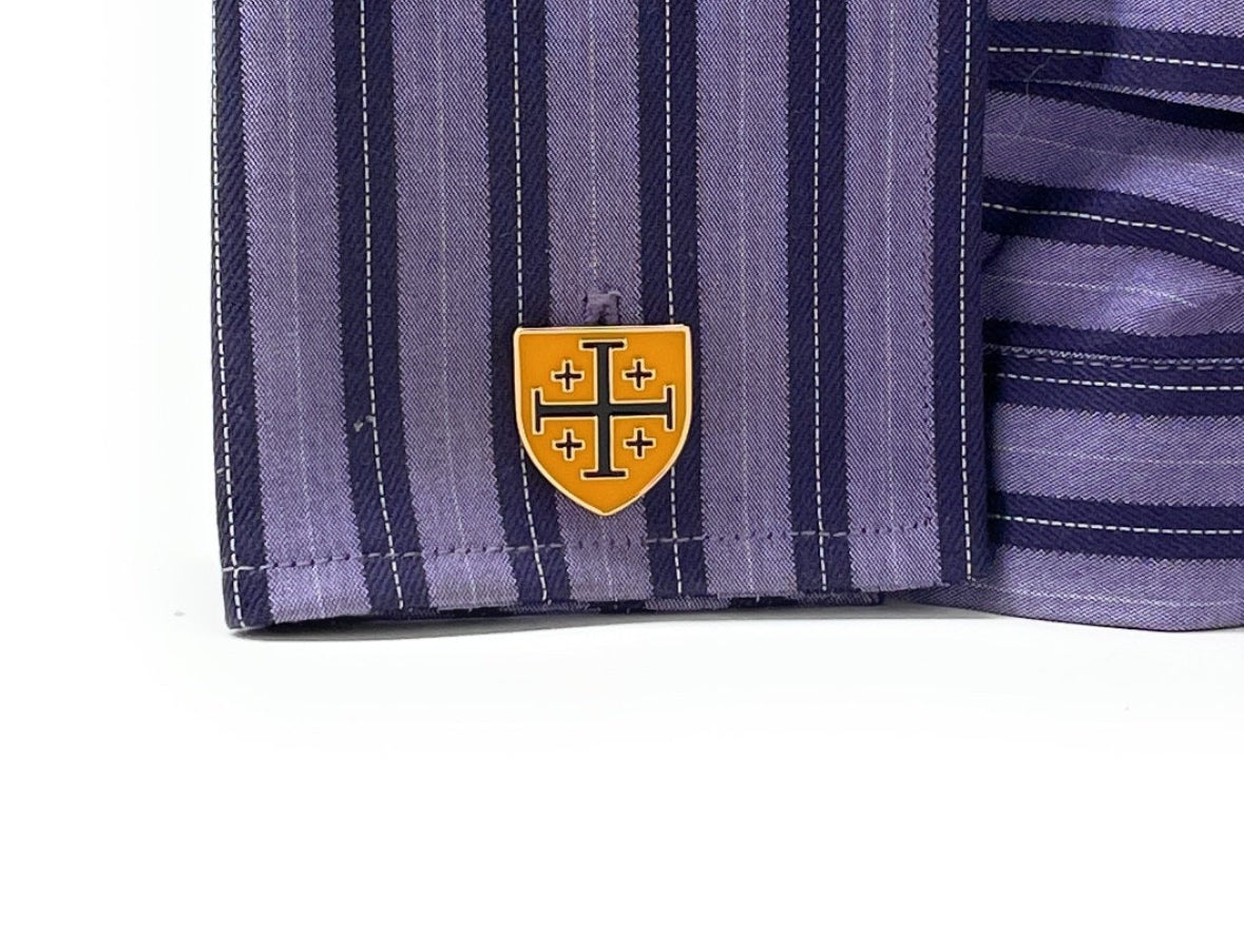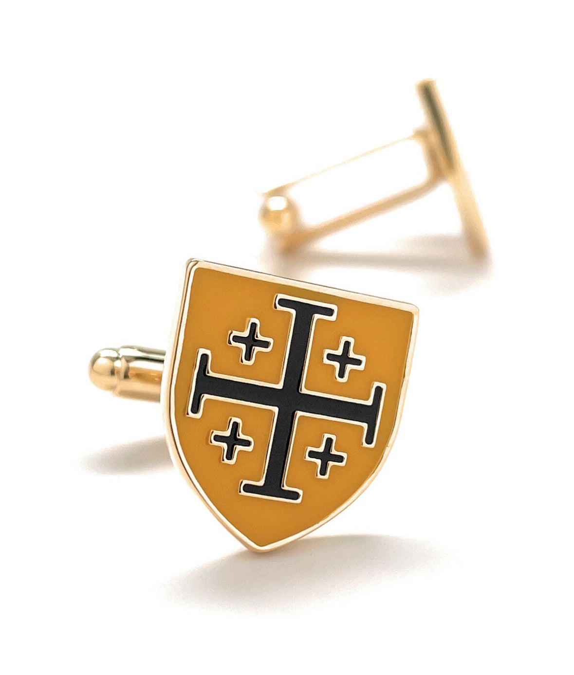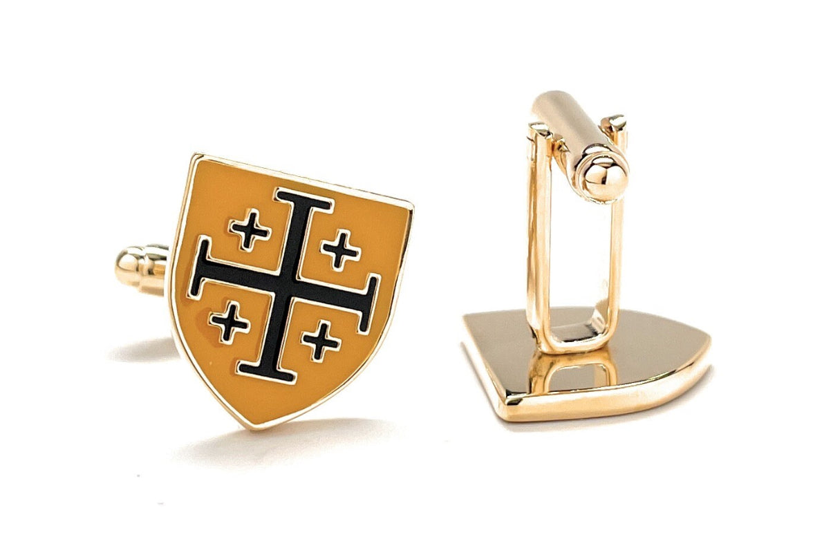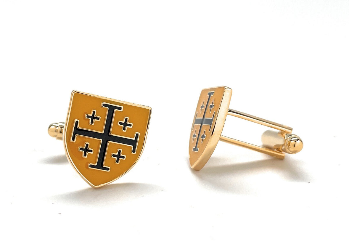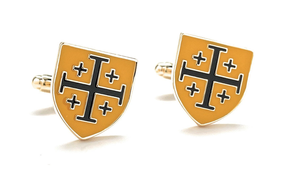 Crusaders Shield Cufflinks Jerusalem Cross Cuffs Yellow and Black Enamel Design Silver Tone 3D Five-Fold Cross Cuff Links