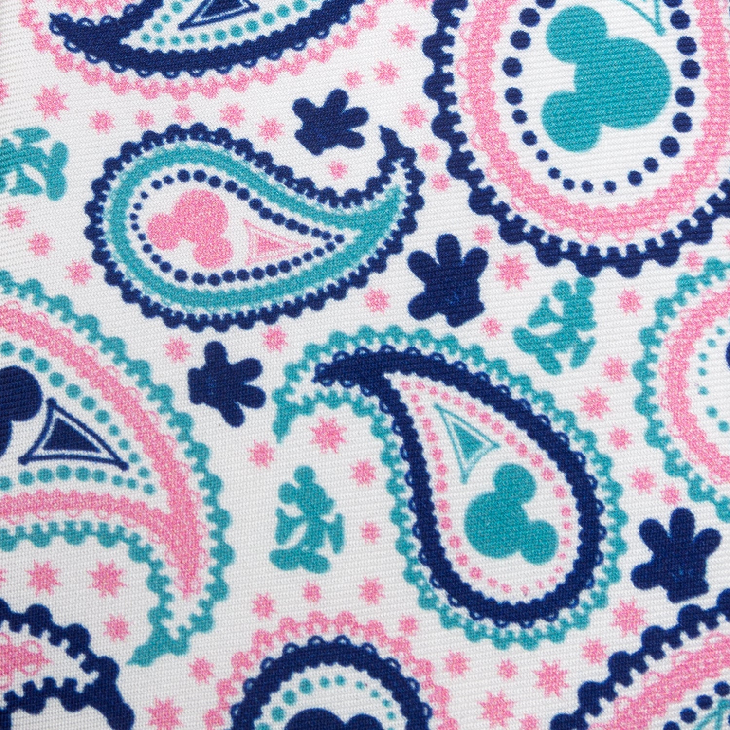 Time to bring color and fun back to your wardrobe! Bright springtime teal, deep navy, and cool bubblegum pink have been brought together against a rich ivory background on this 100% silk slim tie. Look carefully and you'll spot several iconic Mickey Mouse icons nestled among the paisley design, including the classic ears silhouette and a waving hand. What else can you see? Officially licensed by Disney.