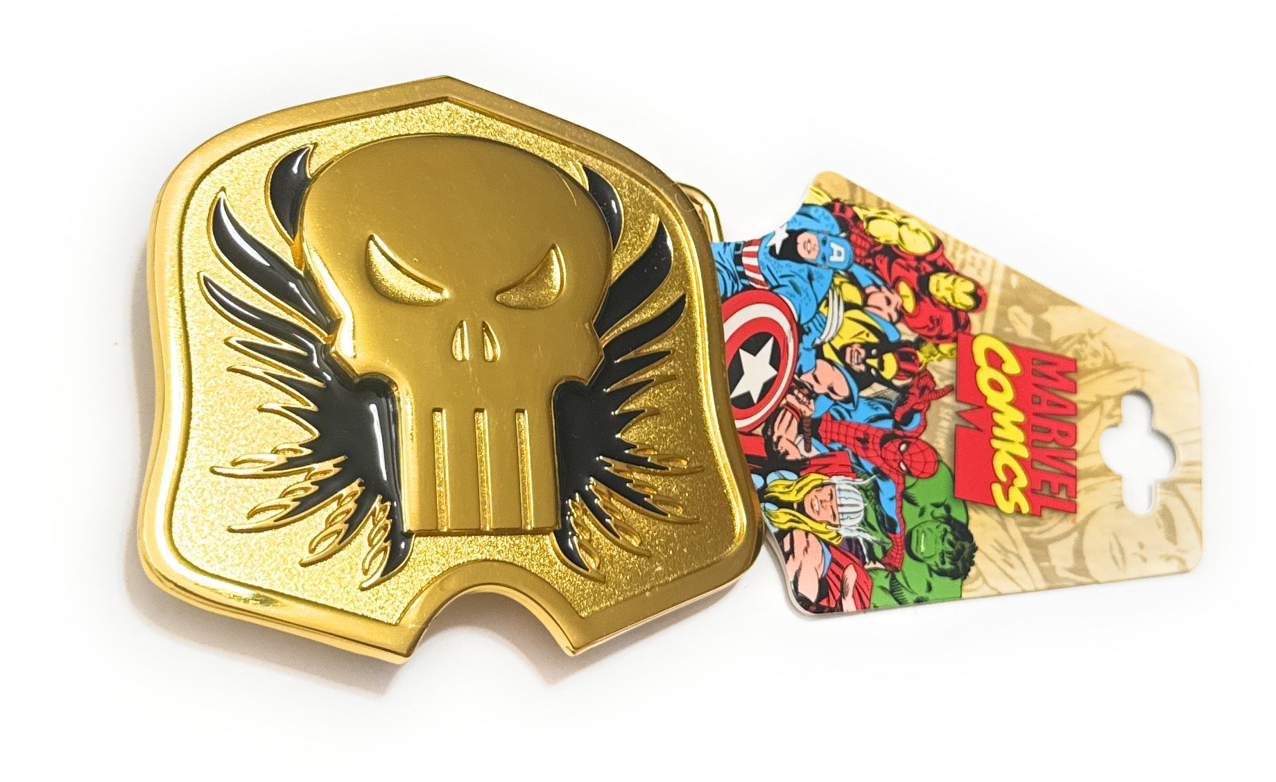Unleash your inner anti-hero with this bold Gold Punisher Skull Belt Buckle. Featuring the iconic Punisher emblem in a striking gold finish with black detailing, this belt buckle is the ultimate statement piece for Marvel fans.