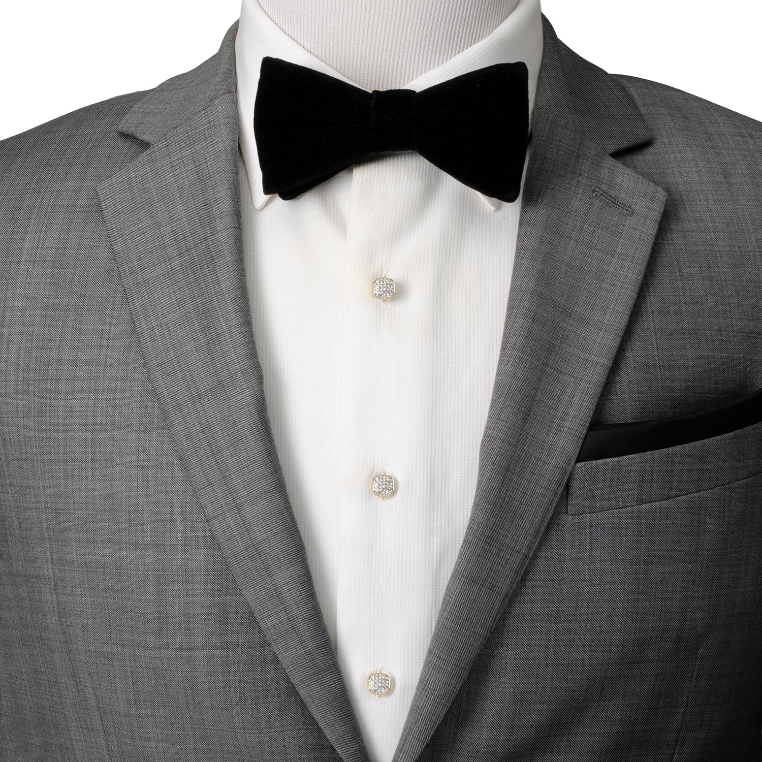 Designed with a brilliant shimmer of elegance, our Gold Stainless Steel White Pave Crystal Stud Set is crafted with some of the world's most delicate and precisely-cut Preciosa crystals. These stunning pavé-set white crystal cufflinks and tuxedo studs will bring a touch of sparkle to your next formal event. Our stud set will stand up to wear and maintain their sleek, shiny look thanks to being crafted from durable stainless steel.