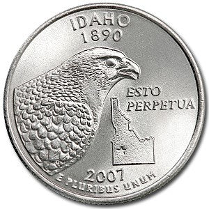 Idaho is the 43rd coin released in the 50 State Quarters Program and the third quarter released in 2007. Idaho, who was admitted into the Union on July 3rd 1890, themed the coin, Esto Perpetua. It highlights an image of the Peregrine Falcon imposing its presence above an outline of the state of Idaho. Launched in 1999, the United States Mint’s 50 State Quarters Program was a 10-year initiative that honored each of the nation’s states in the order that they ratified the Constitution or were admitted into the Union. Each quarter was produced for about 10 weeks and will never be produced again. State designs are displayed on the reverse (tails) of the quarters, while the obverse design displays the familiar image of George Washington. But, to accommodate state designs on the reverse, the words “United States of America,” “Quarter Dollar,” “Liberty,” and “In God We Trust” all appear on the obverse. Idaho is a northwestern U.S. state known for mountainous landscapes, and vast swaths of protected wilderness and outdoor recreation areas. The capital, Boise, is set in the Rocky Mountain foothills and is bisected by the Boise River, which is popular for rafting and fishing. The city’s riverfront Julia Davis Park is a downtown green space containing a rose garden, museums and a zoo.