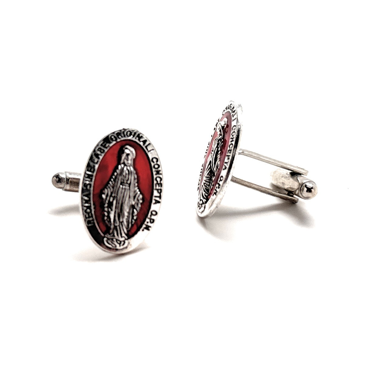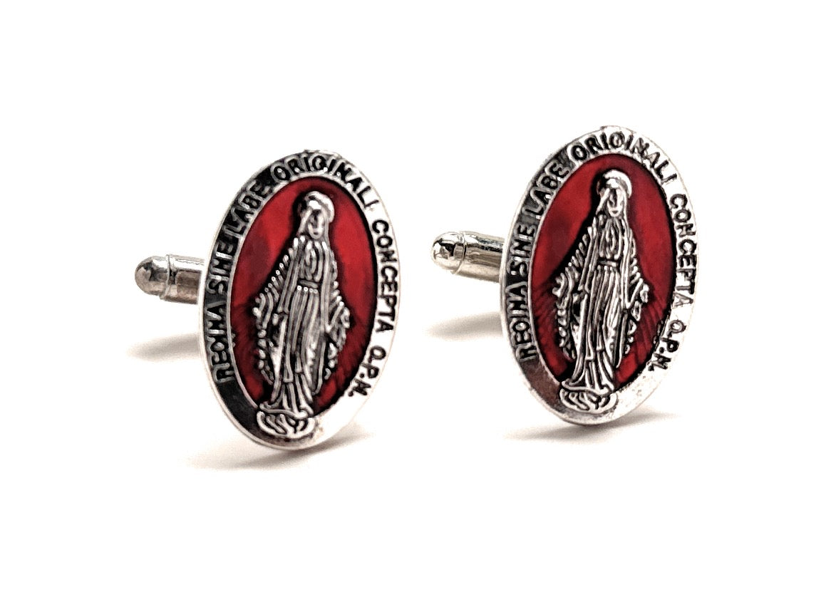 🙏 Carry your faith with style and grace. These Mother Mary Cufflinks feature a beautifully detailed image of the Blessed Virgin Mary set against a rich red enamel background, framed with the inscription "O Mary, conceived without sin, pray for us who have recourse to thee."