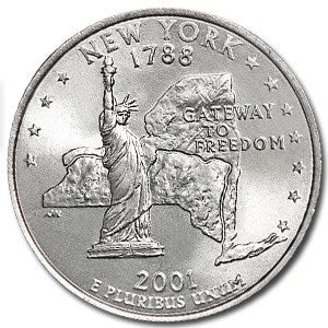 Released on January 2, 2001, this is the 11th coin released in the 50 State Quarters Program and the first released in 2001. New York, admitted into the Union on July 26, 1788, themed the coin, Gateway to Freedom. It highlighted an image of the Statue of Liberty, the state outline, and 11 stars that represents its position when admitted into the Union. Launched in 1999, the United States Mint’s 50 State Quarters Program was a 10-year initiative that honored each of the nation’s states in the order that they ratified the Constitution or were admitted into the Union. Each quarter was produced for about 10 weeks and will never be produced again. State designs are displayed on the reverse (tails) of the quarters, while the obverse design displays the familiar image of George Washington. But, to accommodate state designs on the reverse, the words “United States of America,” “Quarter Dollar,” “Liberty,” and “In God We Trust” all appear on the obverse. New York is a state in the northeastern U.S., known for New York City and towering Niagara Falls. NYC’s island of Manhattan is home to the Empire State Building, Times Square and Central Park. The Brooklyn Bridge connects Manhattan with the borough of Brooklyn. The iconic Statue of Liberty stands in New York Harbor. To the east, Long Island has beaches, the Montauk Lighthouse, the ritzy Hamptons and Fire Island.