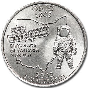 Released on March 11, 2002, this is the 17th coin released in the 50 State Quarters Program and the second released in 2002. Ohio, admitted into the Union on March 1, 1803, themed the coin, Birthplace of Aviation Pioneers. The coin highlights the state's contribution to the history of aviation. It features an early aircraft and an astronaut superimposed as a group on the outline of the state, and stars. Launched in 1999, the United States Mint’s 50 State Quarters Program was a 10-year initiative that honored each of the nation’s states in the order that they ratified the Constitution or were admitted into the Union. Each quarter was produced for about 10 weeks and will never be produced again. State designs are displayed on the reverse (tails) of the quarters, while the obverse design displays the familiar image of George Washington. But, to accommodate state designs on the reverse, the words “United States of America,” “Quarter Dollar,” “Liberty,” and “In God We Trust” all appear on the obverse. Ohio is a state in the Midwestern region of the United States. Of the fifty states, it is the 34th-largest by area, and with a population of nearly 11.7 million, is the seventh-most populous and tenth-most densely populated.