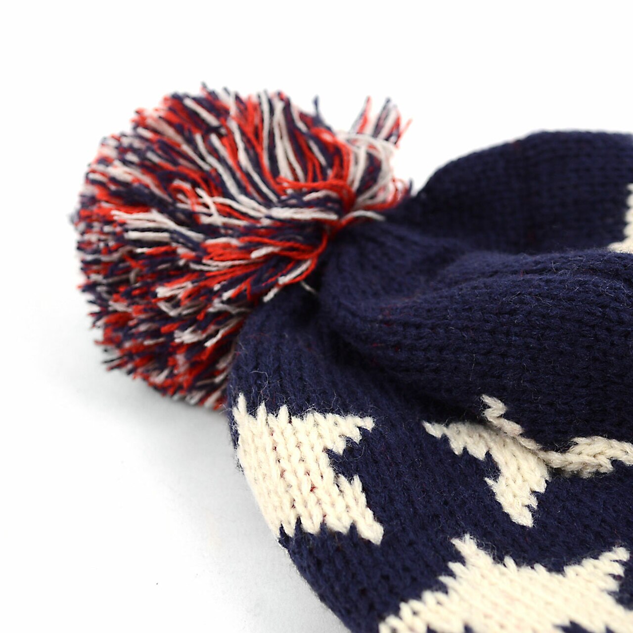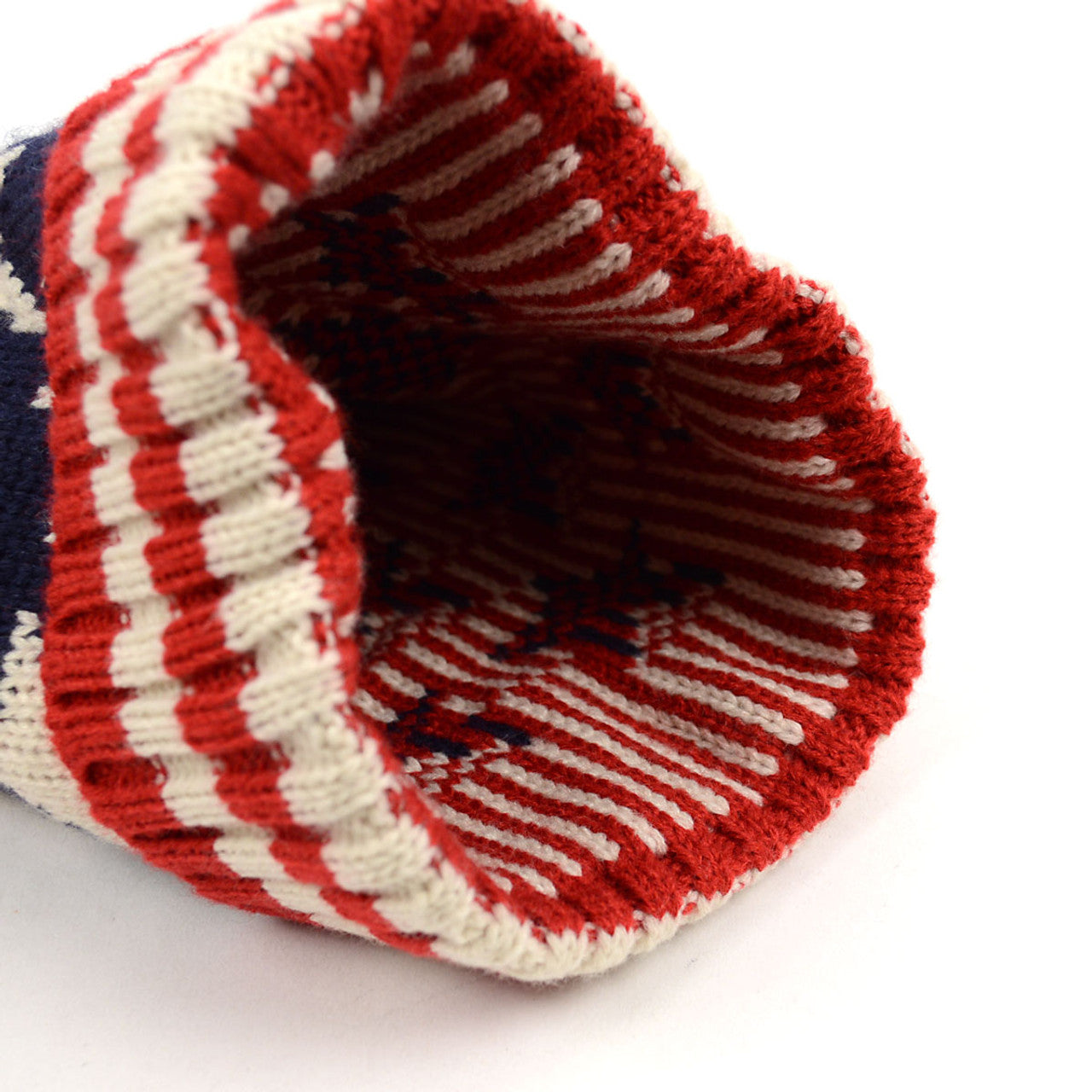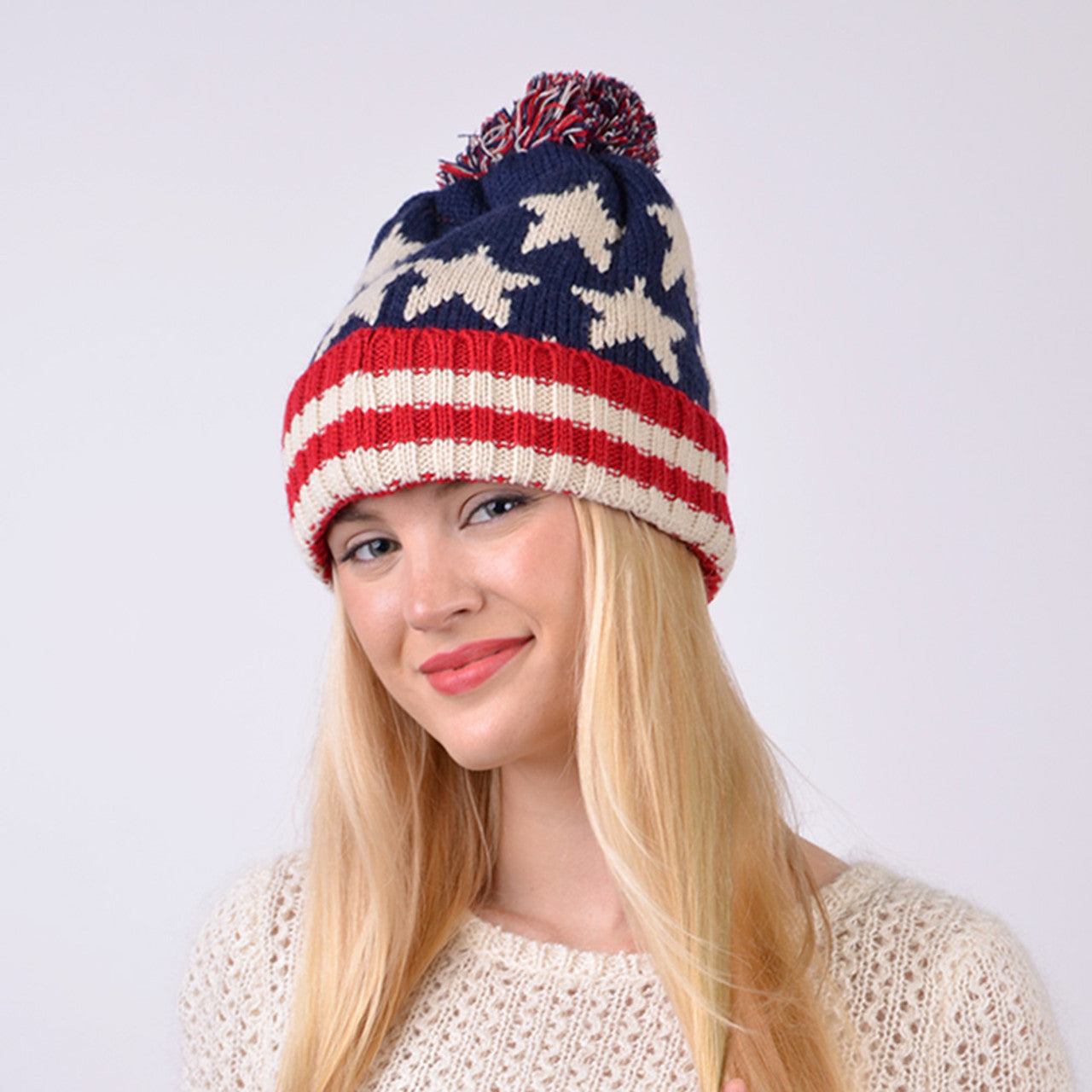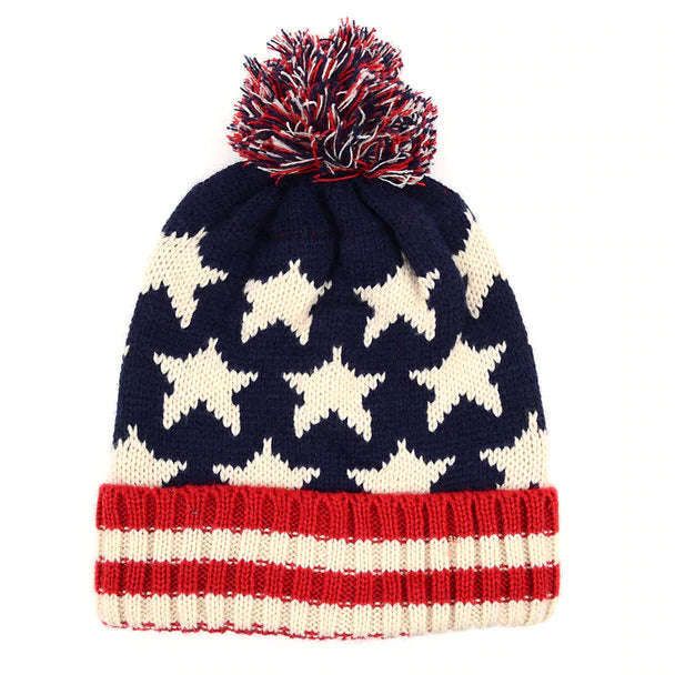 Old School Unisex American Flag Knit Pom Beanie Ski Hats with Stars Red White and Blue
