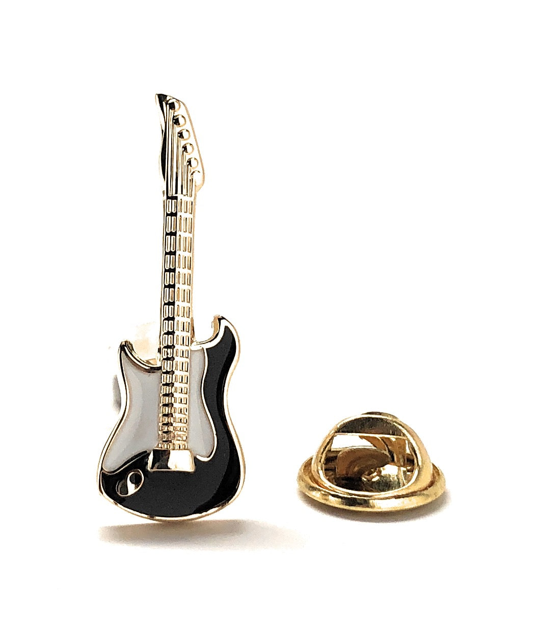 Rock and Roll Guitar Pin Black White Gold Trim Enamel Pin