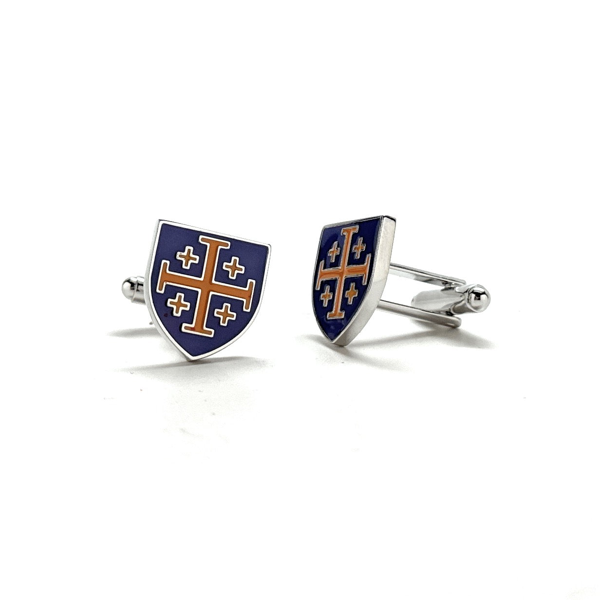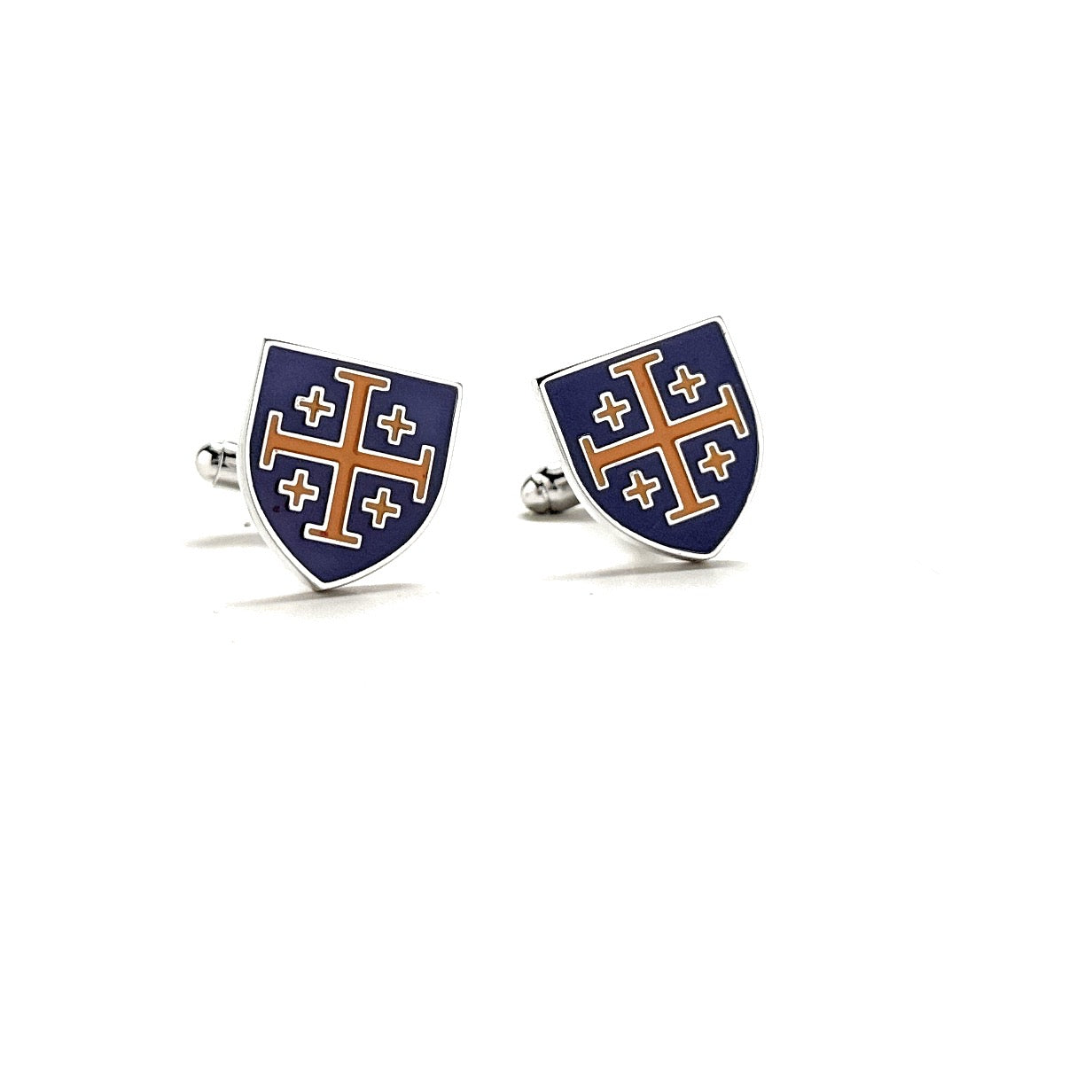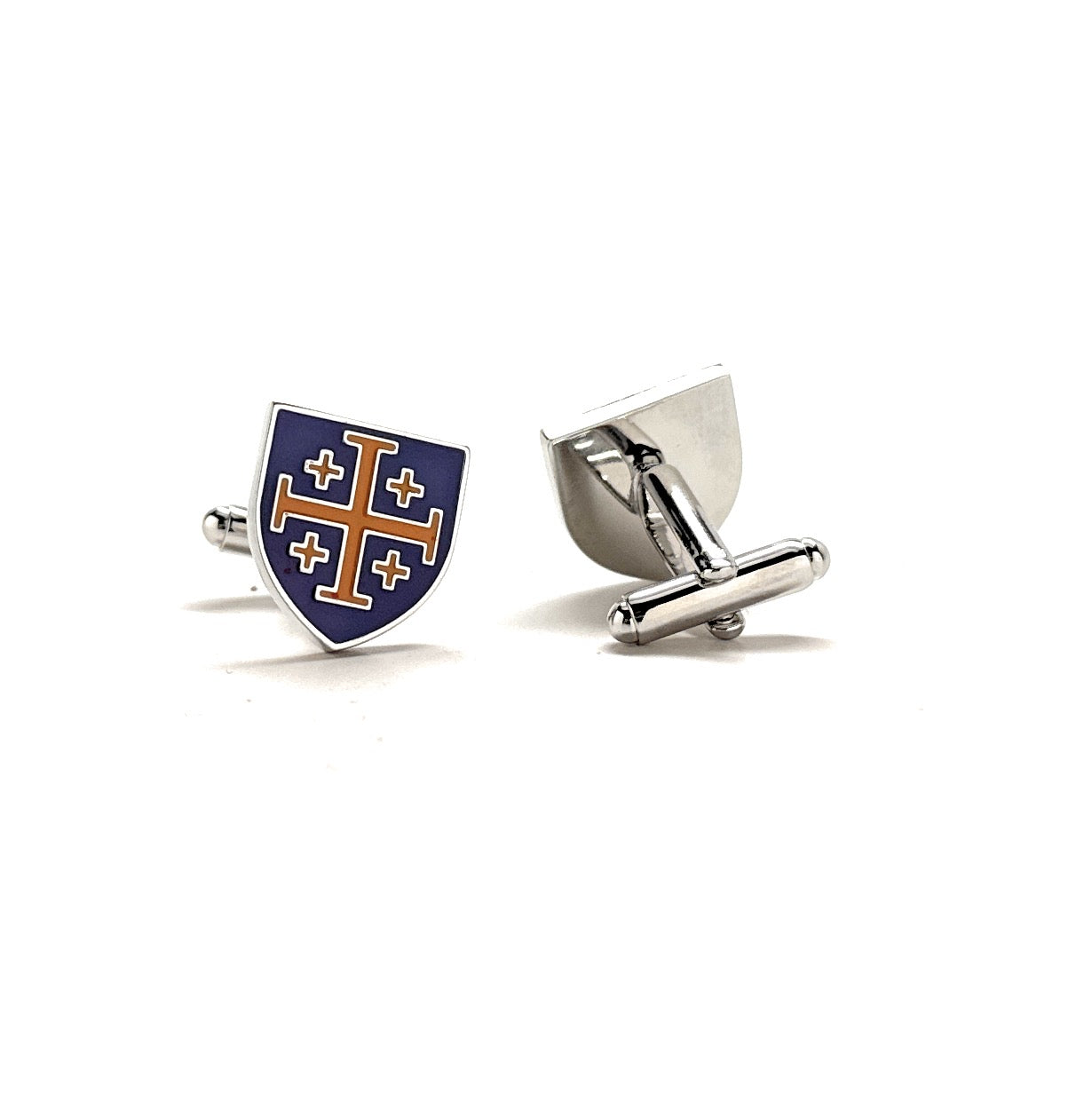 Royal Crusaders Shield Cufflinks Jerusalem Cross Cuffs Purple and Gold Enamel Design Silver Tone 3D Five-Fold Cross Cuff Links