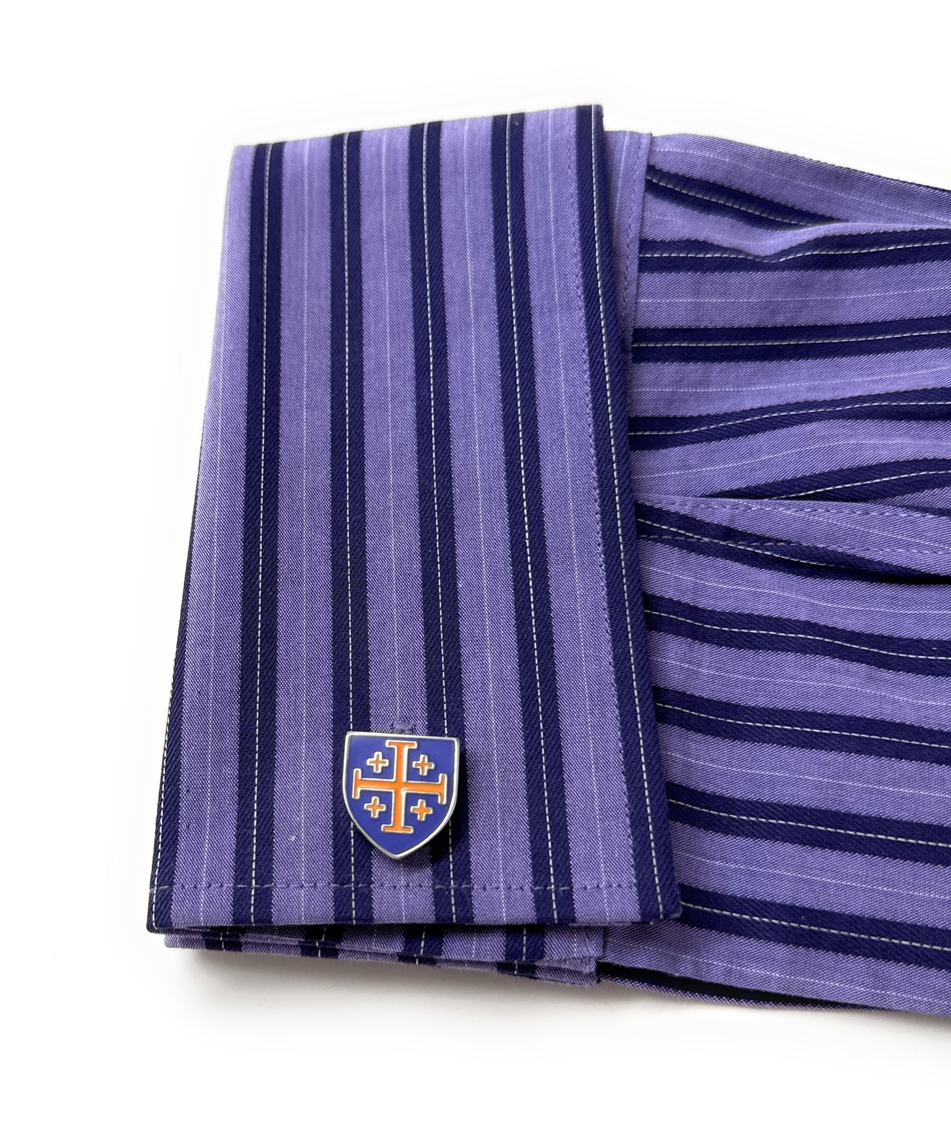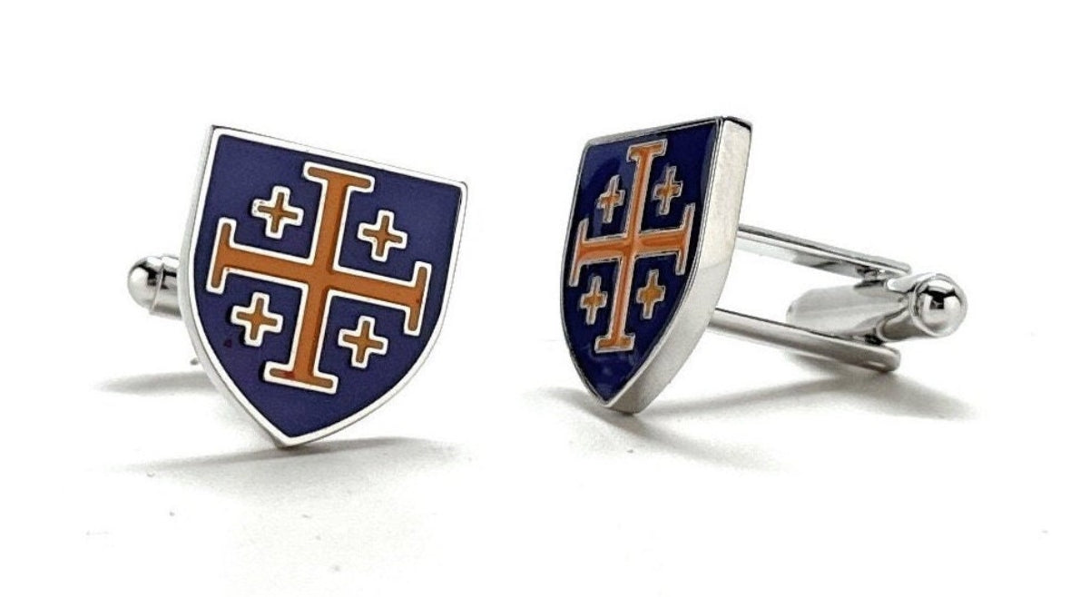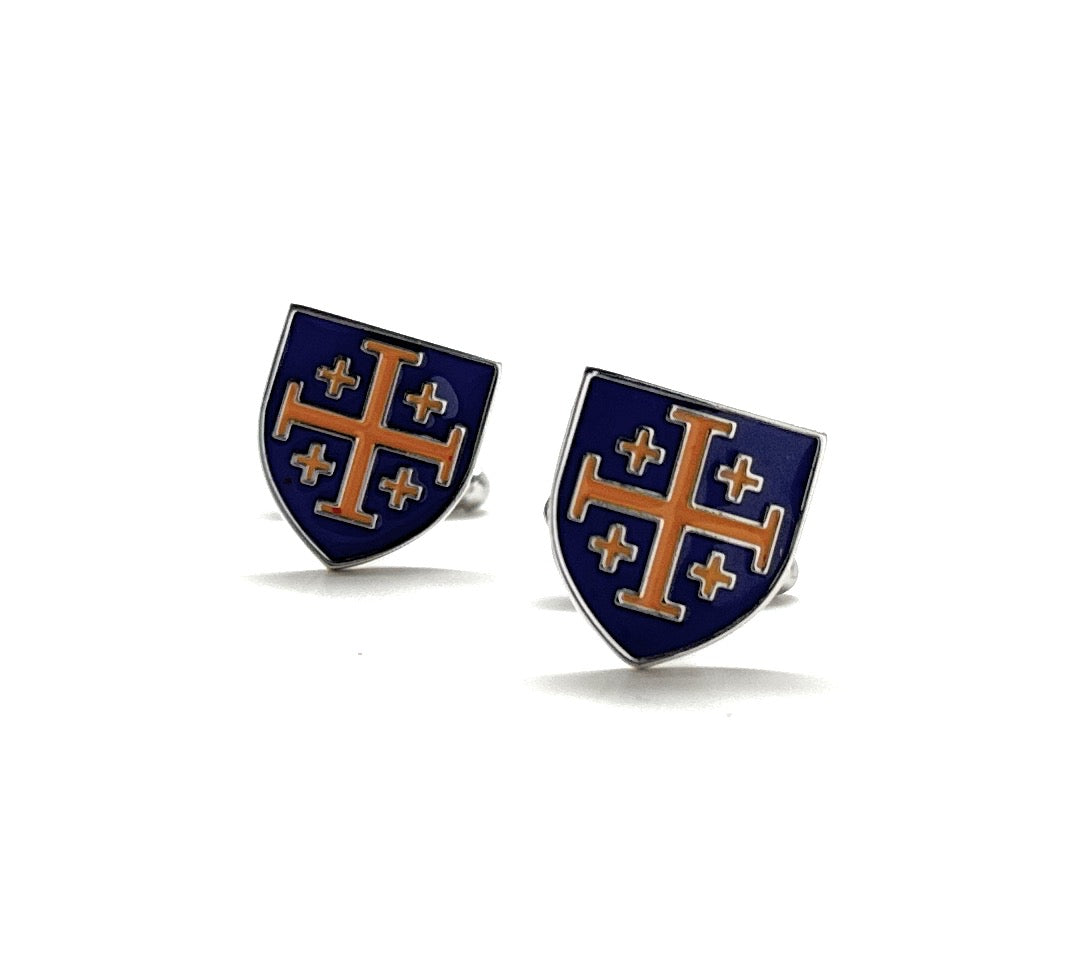 Royal Crusaders Shield Cufflinks Jerusalem Cross Cuffs Purple and Gold Enamel Design Silver Tone 3D Five-Fold Cross Cuff Links