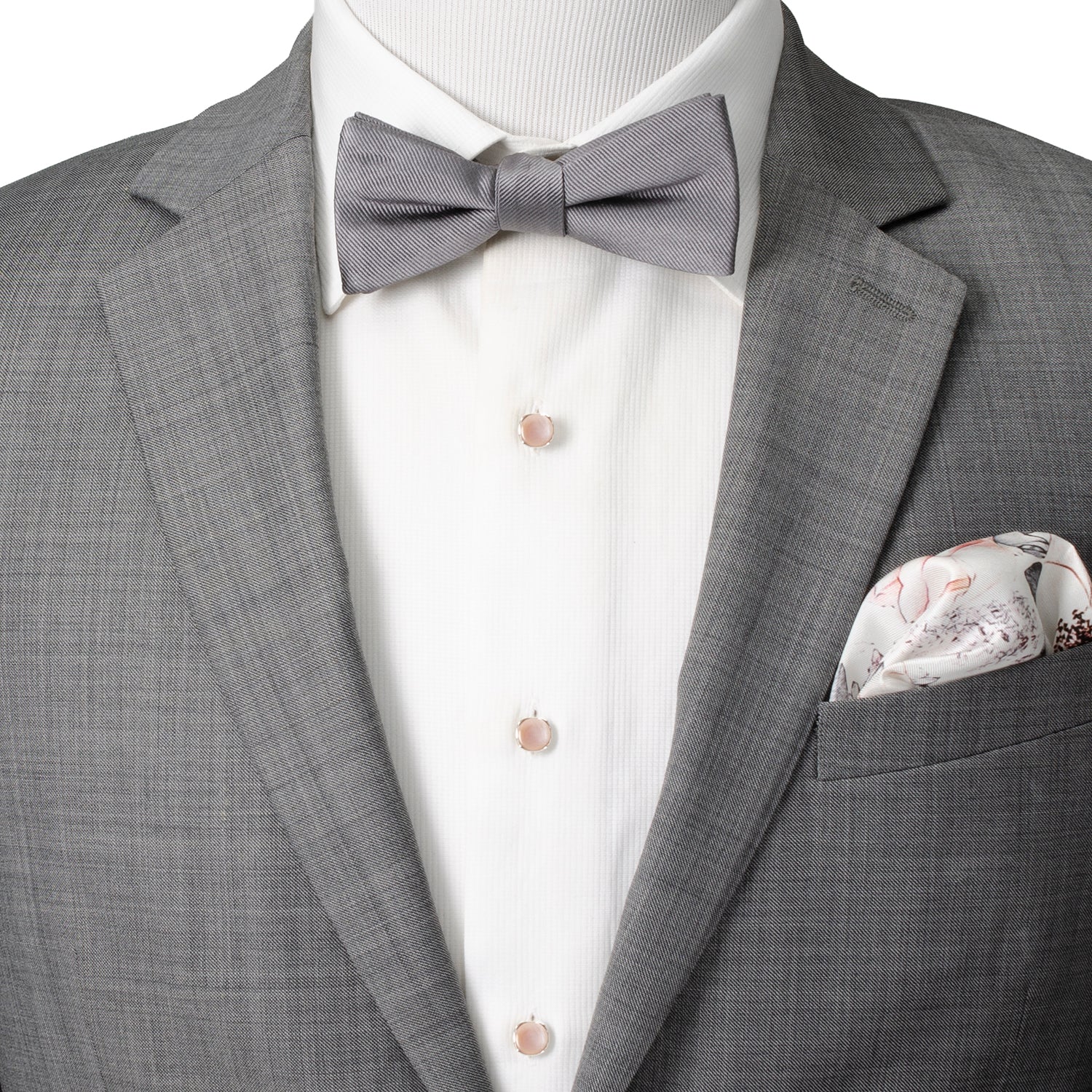 Beautiful creamy pink mother of pearl has been cut into a cushioned disc and surrounded in shiny sterling silver, to create this set of elegant tuxedo studs. Soft-edged square fixed backings keep your studs in place all night long, and this set can be worn alone or paired with our matching cufflinks for a perfect spring or summer formal look. Includes individual gift box.