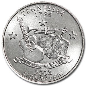 Released on January 2, 2002, this is the 16th coin released in the 50 State Quarters Program and the first released in 2002. Tennessee, admitted into the Union on June 1, 1796, highlighted the image of several musical instruments, the fiddle, the trumpet, and the guitar. President William J. Clinton was in office when this legislation was signed. Three United States Mint Directors served under President Clinton's tenure; David J. Ryder of Idaho, Philip N. Diehl of Texas, and Jay W. Johnson of Wisconsin.