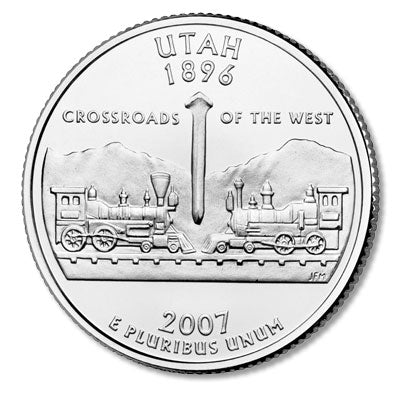 Utah is the 45th coin released in the 50 State Quarters Program and the fifth coin released in 2007. Utah, admitted into the Union January 4, 1896, themed the coin, Crossroads of the West. It highlights two locomotives moving toward the golden spike that join Central Pacific and Union Pacific railroads. Launched in 1999, the United States Mint’s 50 State Quarters Program was a 10-year initiative that honored each of the nation’s states in the order that they ratified the Constitution or were admitted into the Union. Each quarter was produced for about 10 weeks and will never be produced again. State designs are displayed on the reverse (tails) of the quarters, while the obverse design displays the familiar image of George Washington. But, to accommodate state designs on the reverse, the words “United States of America,” “Quarter Dollar,” “Liberty,” and “In God We Trust” all appear on the obverse. Utah is a state in the Mountain West region of the United States. It is bordered by Colorado to the east, Wyoming to the northeast, Idaho to the north, Arizona to the south and Nevada to the west. It also touches a corner of New Mexico in the southeast.