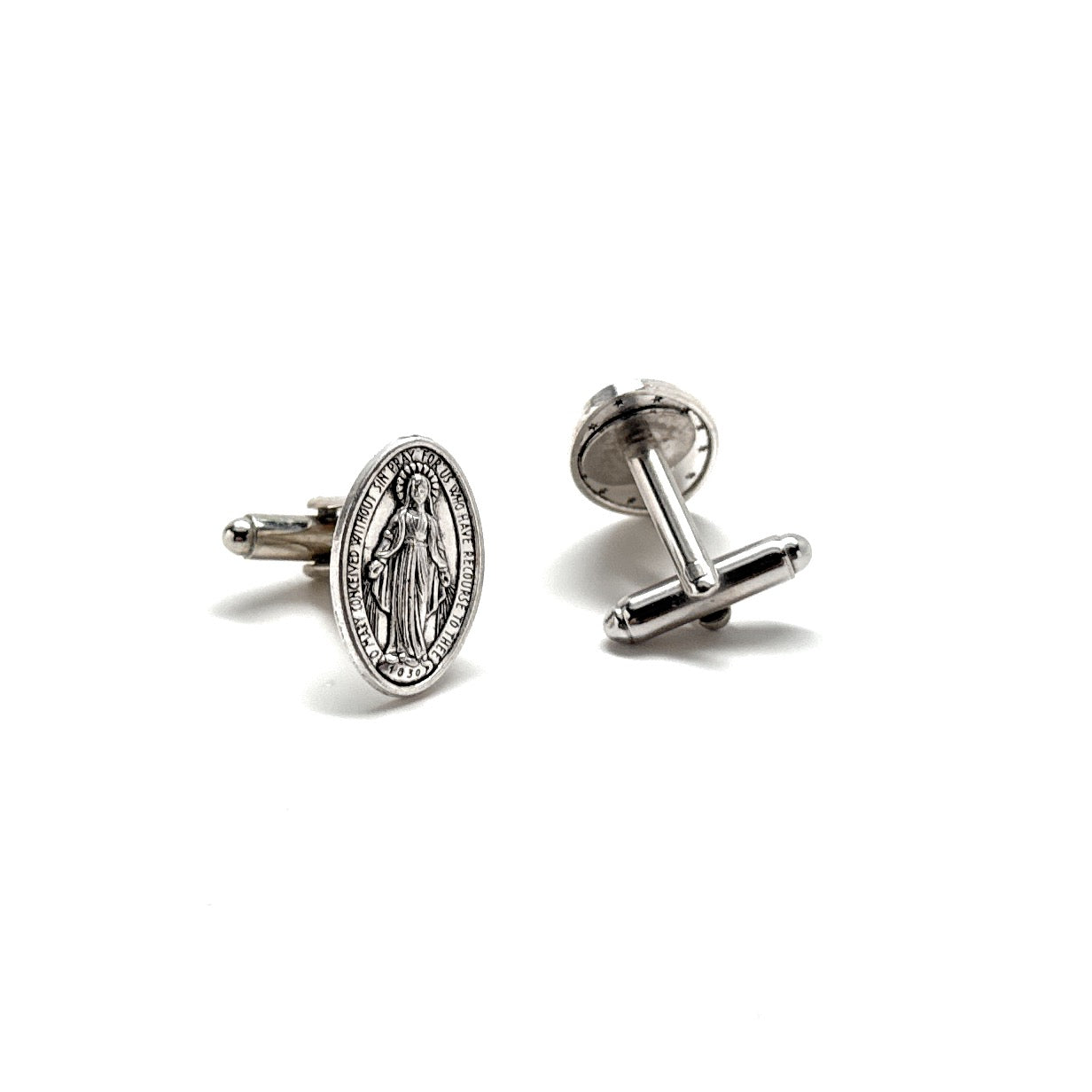 These handcrafted Virgin Mary cufflinks honor the sacred beauty of Our Lady of Grace, also known as the Blessed Mother or Virgen María. Each oval cufflink features a detailed depiction of Mary surrounded by the prayer:
