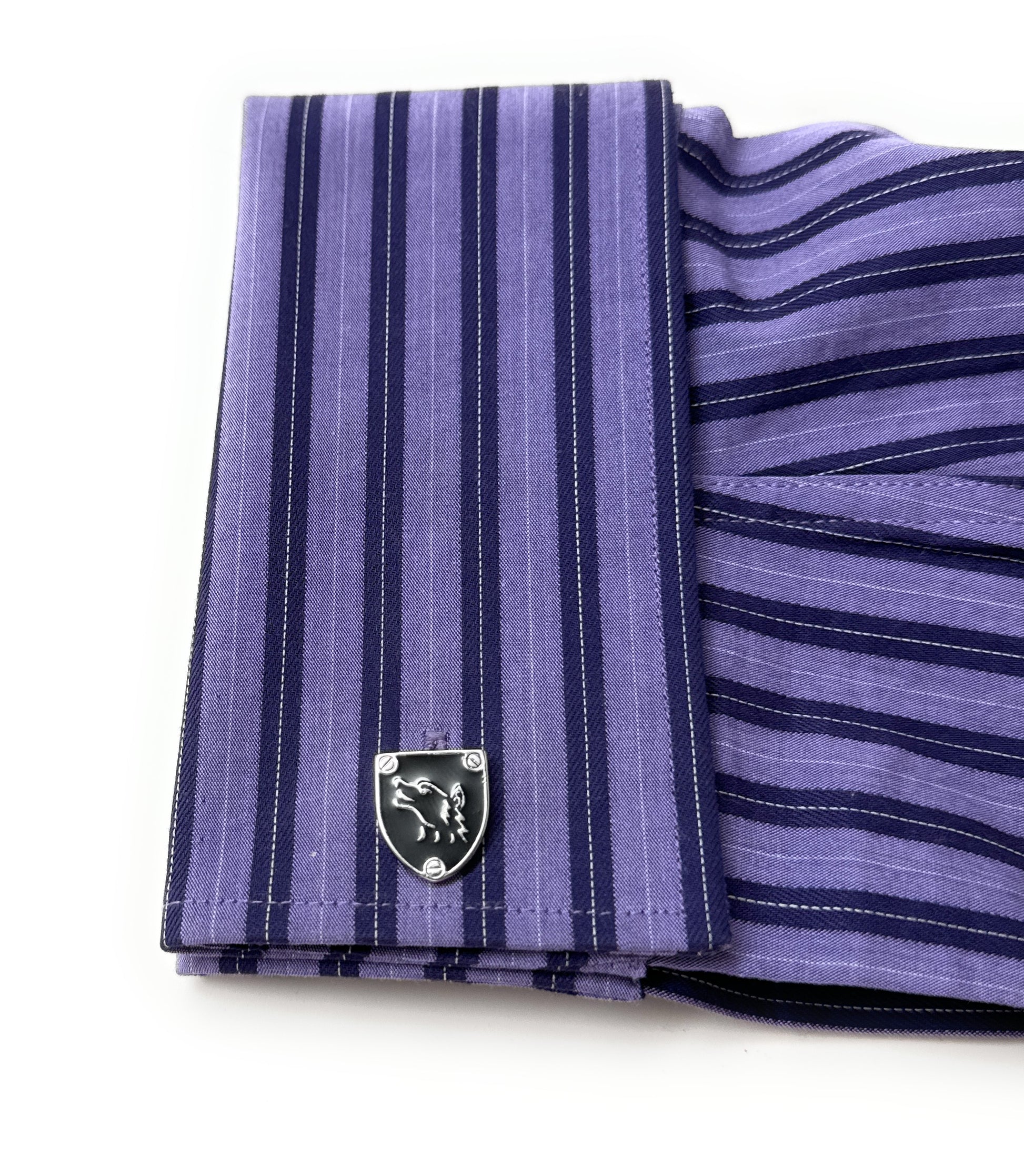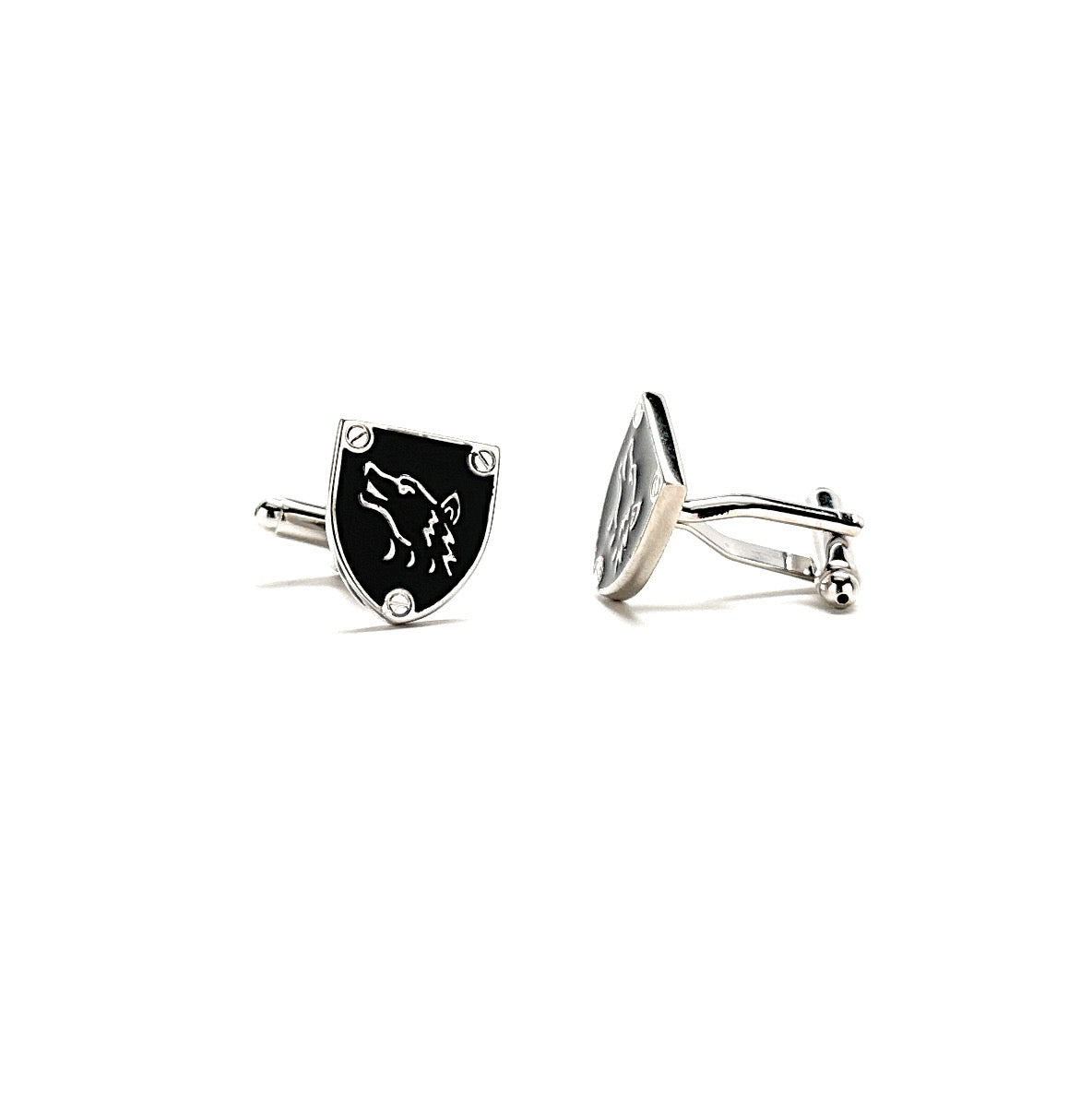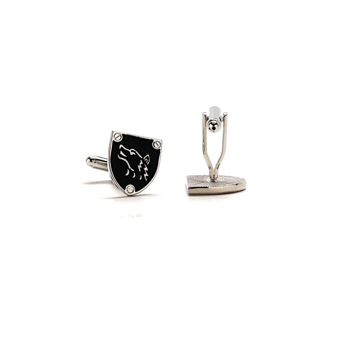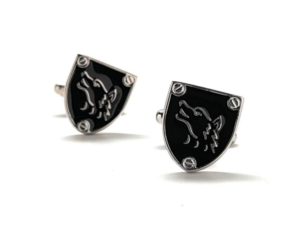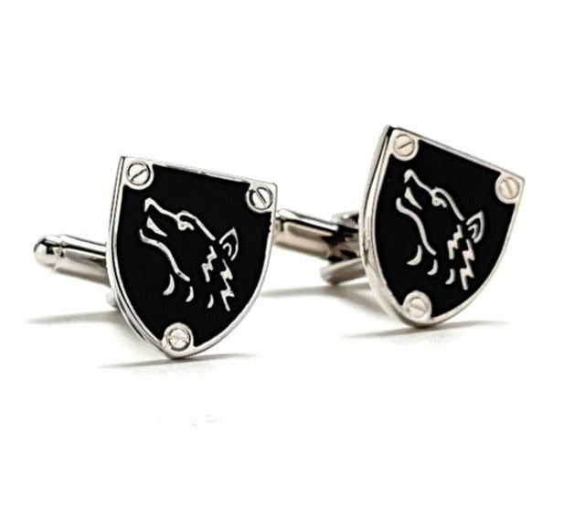 Unleash your inner alpha with these bold and sophisticated Silver & Black Wolf Cufflinks. Featuring a sleek enamel shield design with a howling wolf emblem, these cufflinks are a perfect blend of rugged strength and refined style. Whether you're heading to a formal event, making a statement at work, or searching for a unique gift, these cufflinks bring edge and personality to any suit.