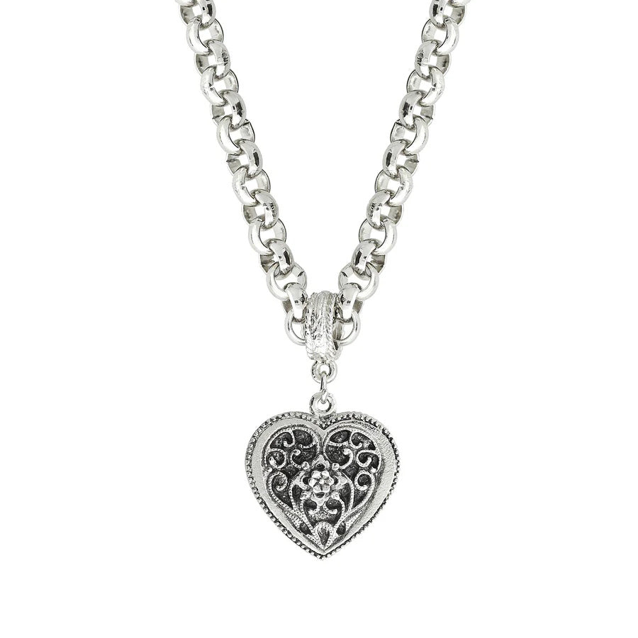 This Women's Necklace is a stunning piece with a silver filigree flower heart pendant. The necklace is 16" in length with a 3" extender, providing versatility in wear. Elevate your outfit with this beautiful, expertly crafted necklace.