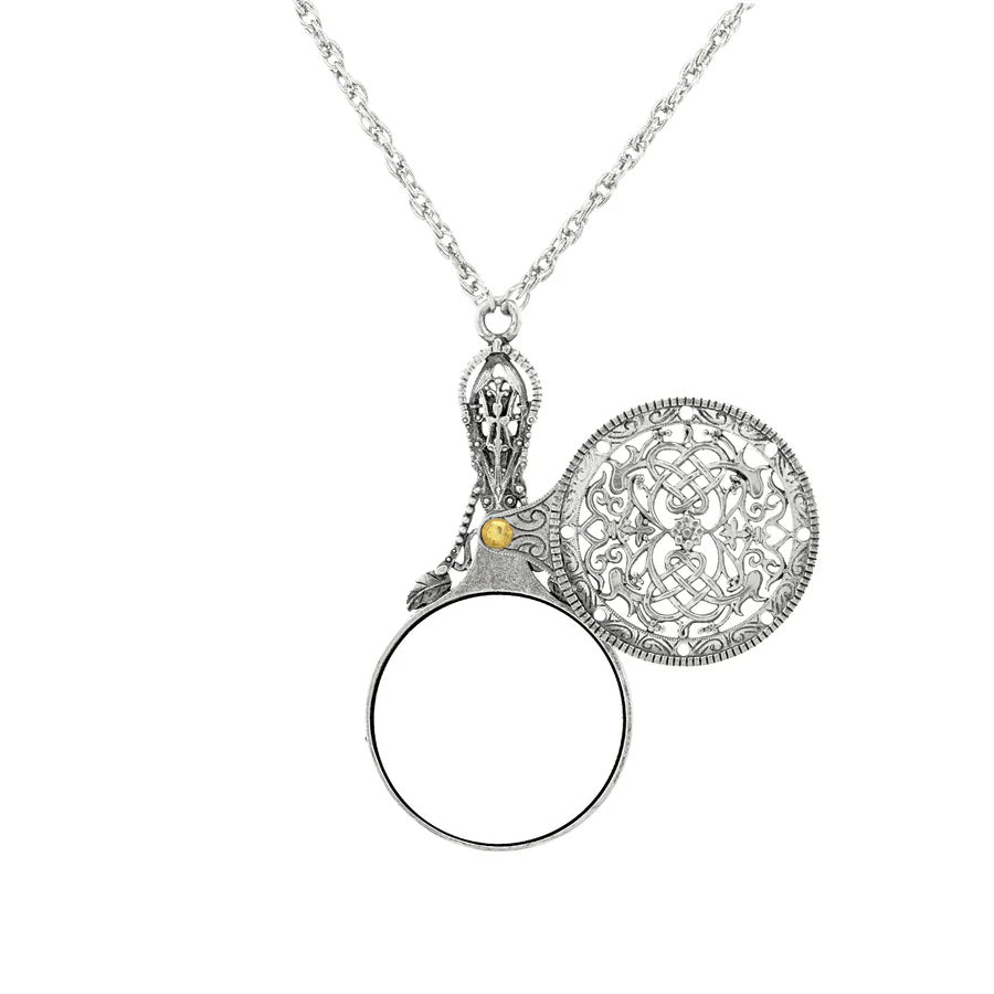 Expertly crafted for the modern woman, this stunning silver pewter necklace features a unique sliding filigree cover that opens to reveal a functional mirror. With a sleek and versatile design, this necklace provides convenience and elegance, making it the perfect addition to any outfit.